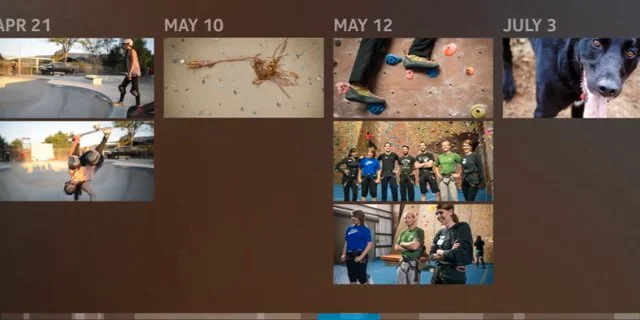 Intent was to organize and scan large amounts of content, predominantly video. The galleries are organized chronologically and grouped by types of activity. The preview gallery allows the user to preview a video and navigate between adjacent content. The main gallery can be accessed seamlessly from the preview gallery. This gallery can be searched through a random access timeline that allows the user to scan through large amounts of content to find something specific.
